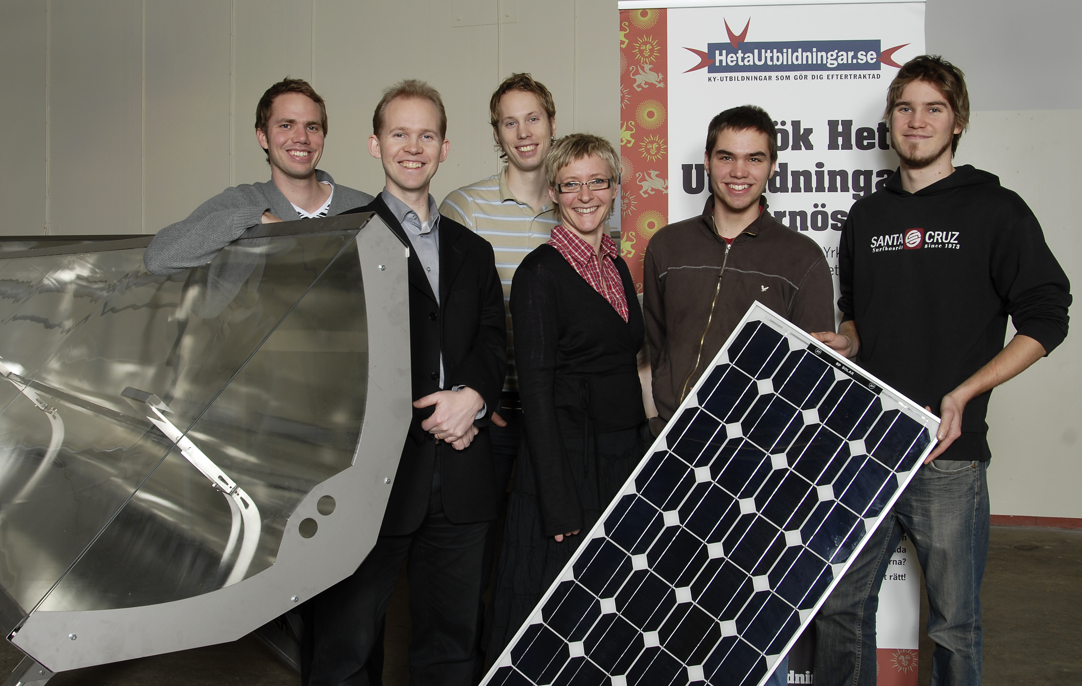 Utbildning - Företagande - Forskning. Johan Nilsson, Joakim Byström och Olle Olsson från Absolicon tillsammans med Jessica Ögren och studenter från solenergiteknikerutbildningen i Härnösand. (Klicka för stor bild)